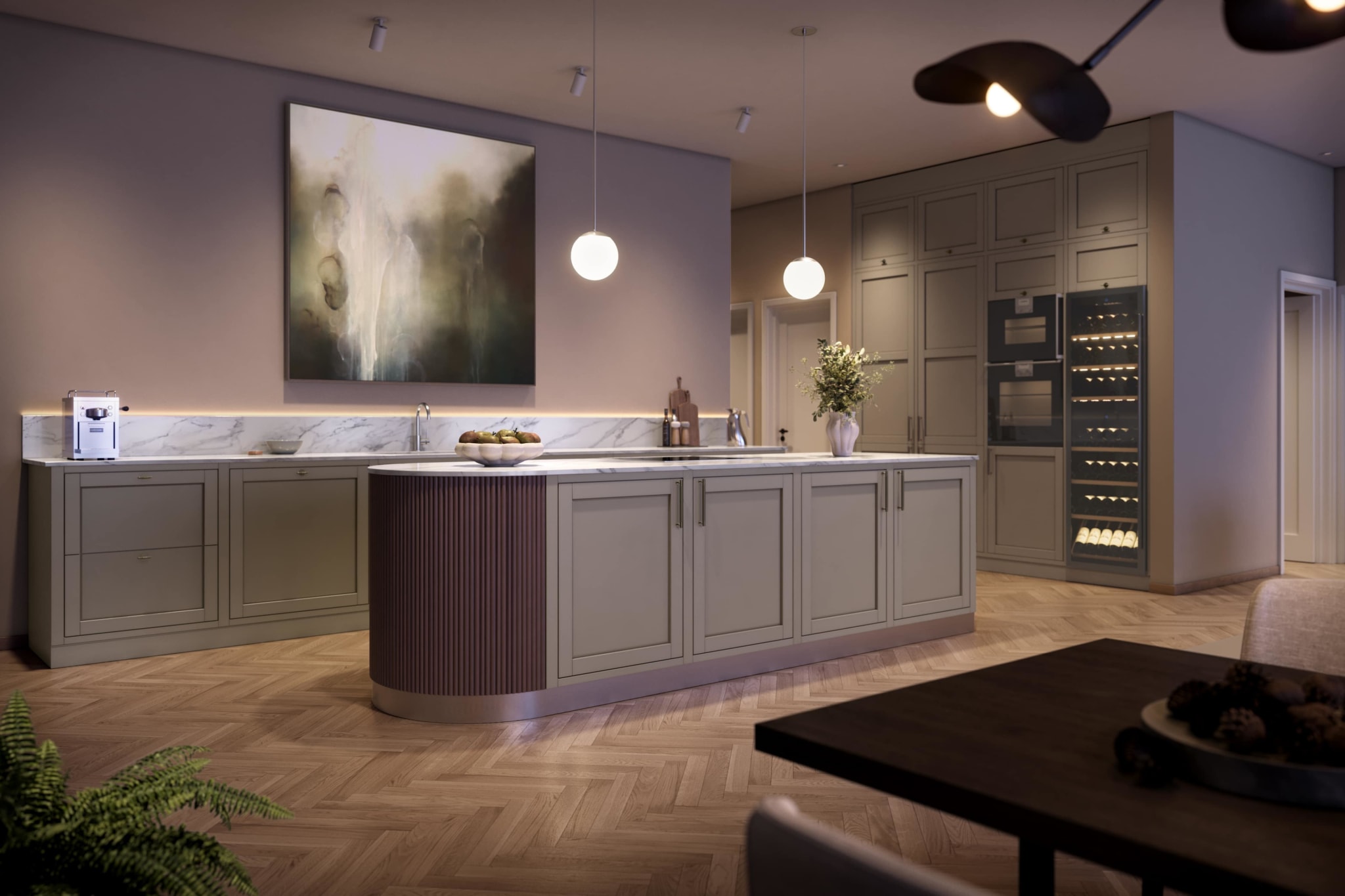 Kjøkkenet er utstyrt med en eksklusiv hvitevarepakke fra det anerkjente merket Gaggenau, og et integrert vinskap som gir kjøkkenet et sofistikert preg. De eksklusive benkeplatene i stein forsterker det stilrene uttrykket ytterligere.